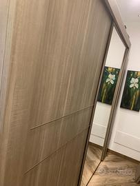 Vendo armadio 2 ante scorrevoli con 4 appenderie in basso e il resto tutto a ripiani con comodini e comò.Il como’presenta dei graffi come in foto ,i comodini sono in ottime conzioni.