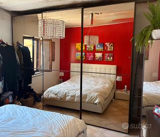 Vendo set completo: 1) Armadio a specchio, moderno, legno wengè, n.3 scomparti, misure 306x255x64; 2) Comó 3 cassetti in legno wengè, misure 144x73x50, aperto 171; 3) Totem con 2 specchi e appendino esterno, 6 scomparti in vetro removinili. Legno prestigioso. Se interessati anche singolarmente con prezzo da concordare. Trasporto a carico dell’acquirente.