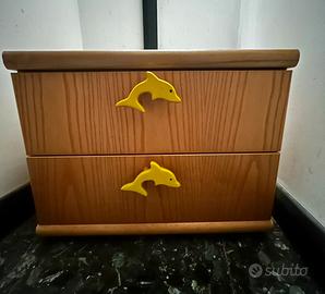 Armadio misure: 230x104x60 cm completo di cassettiera, mensola e bastone appendiabiti + Comodino 2 cassetti, misure: 52x47x40 cm inclusi pomelli originali + pomelli delfino gialli.