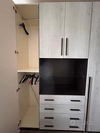 Armadio 4 ante, vano a giorno porta tv, 4 cassetti e ampia cabina armadio d'angolo. Dimensioni armadio 310x60x253 Modello Eleonora di Mondo convenienza dal costo di 1180 Vendo causa trasloco Inclusa anche mensola di cristallo nel vano TV della parte centrale.