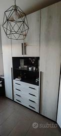 Armadio composto da due ante singole, vano a giorno porta tv, 4 cassetti, cabina armadio d'angolo dove poter ricavare anche lo spazio scrivania.