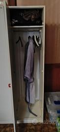 Armadio colore bianco con maniglie rosso, a tre ante.