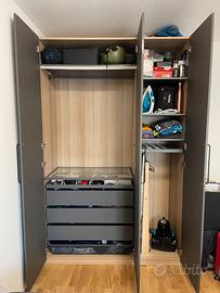 Vendo armadio componibile ikea in ottime condizioni, 3 cassetti chiusi più 1 a rete, cassetto per cravatte/orologi, ecc., pianale in vetro, appendi pantaloni. L'armadio è già smontato.