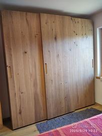 armadio costruito internamente in abete nuovo con misure lunghezza 260 cm h 260 prof. 62 parti esterne come i 2 fianchi laterali in ROVERE RUSTICO con qualche crepetto e spaccatura stuccato con stucco nero bicomponente, 3 ante scorrevoli ammortizzate magnetica KIT BORTOLUZZI in apertura e chiusura disposto in 3 moduli: