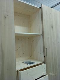 armadio costruito internamente in abete nuovo con misure lunghezza 260 cm h 260 prof. 62 parti esterne come i 2 fianchi laterali in ROVERE RUSTICO con qualche crepetto e spaccatura stuccato con stucco nero bicomponente, 3 ante scorrevoli ammortizzate magnetica KIT BORTOLUZZI in apertura e chiusura disposto in 3 moduli: -Vano Sx 3 ripiani aggiustabili in altezza con ferramenta idonea, bussola e viti con staffetta di fissaggio mentre centrale fisso per stabilità dell’armadio su cui sotto troveremo bastone porta abiti in alluminio. -Vano centrale predisposto 1 cassettiera h 100 circa con 4 cassetti su guide ammortizzate in chiusura blum, cassetto interno in abete massello apertura con maniglia a gola fresata ricavata sul frontale, ogni cassetto con altezza circa 23 cm, nella parte superiore troveremo 1 ripiani aggiustabili in altezza. -Vano Dx disposto come il sx. Le 3 ante saranno costruite a telaio in abete con nido d’ape internamente e rivestito ambo i lati con cartelle in massello da 6 mm con venatura ORIZZONTALE in modo che non si muova nel tempo in cui la sx scorrerà a dx, la dx a sx e la centrale a dx completo di raddrizzanti in modo da poter registrarle in caso di bisogno, interno in abete nuovo. Maniglia ad incasso traforata come foto. Avranno uno spessore da 32 mm le ante completo di kit BORTOLUZZI con sistema ammortizzato magnetico completo di agganci con sgancio rapido superiore e inferiore su cui scorrerà direttamente sul binario. Completo di piedini livellatori per mettere a bolla il tutto (staccato dal muro superiore in quanto servono 10 cm di poter sormontare sopra il pannello con anta e ferramenta). Il tutto spazzolato in modo a risaltare le venature, completo di finitura oliata su rovere e su abete. il tutto spazzolato con finitura. mobile è già stato venduto e costruito su commissione non teniamo magazzino ma nessun problema per riprodurlo. ASTENERSI RIVENDITORI COMMERCIANTI.