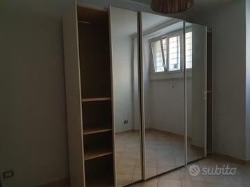 Armadio bianco laccato con tre ante scorrevoli a specchio. In ottime condizioni. Misure: h. 2,45 x 2,68 x 65. Anta centrale con 5 ripiani. Anta laterale sx con 3 ripiani. Anta laterale dx un ripiano centrale con due stecche per appendere cappotti. Smontaggio e ritiro a carico dell'acquirente.