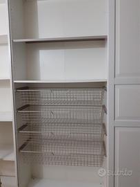 Armadio bianco con ante scorrevoli. Anta tutta adibita a scarpiera.Anta con mensole.Anta con comodissimi cesti estraibili.Anta con mensole a metà perché avevo calorifero dove è stato tagliato schienale,c'è possibilità sostituirlo.Mensole 2 leggermente rovinate.Dimensioni 4 bei antoni scorrevoli da 1 metro l'uno. Altezza 2,36 profondità interno 36cm con ante 42cm.