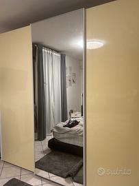 Vendo armadio con ante scorrevoli(3 ante da 90). Le ante laterali all’interno contengono cassetti. Letto (marca Lago) imbottito con doghe in legno. Vendo per trasloco definitovo via dall’Italia.