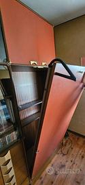 Sistema armadio con parte libreria e parte con un letto singolo a scomparsa. Finitura mogano con ante rosso mattone. Adatto per camera ragazzi; disponibile a parte anche il letto singolo con due cassettoni