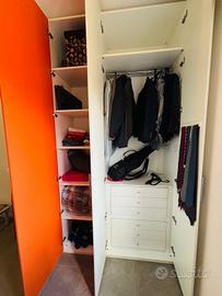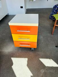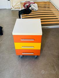 armadio con accanto libreria e comodino colorati adatti a camera di ragazzi acquistato da mobilificio. armadio misure H290 per 150 profondo 60 colonna H290 per 45 per 50 di profondità comodino H62 compresi 10 cm delle ruote larghezza 47 per 45cm.