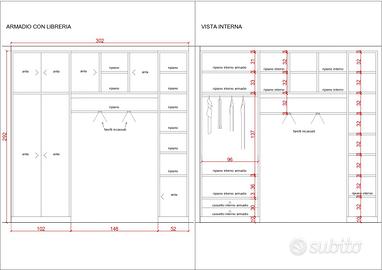 Composto in parte da una libreria a ponte con vani a giorno e vani chiusi e in parte da un armadio chiuso da ante all'interno del quale è possibile riporre vestiti e accessori grazie alla presenza di ripiani, cassetti e barra appendiabiti.