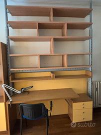 La struttura di destra si puo facilmente personalizzare in altezza e in numero di scaffali. È inoltre composta da una scrivania molto comoda e da una cassettiera con 4 cassetti (2 più piccoli e 2 più grandi). Dimensioni della scrivania cm 153x60x75H. Dimensioni della cassettiera cm 59x45x58H.