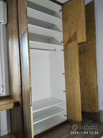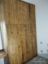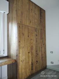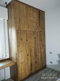 Armadio costruito in laminato bianco liscio con misura lunghezza 190 prof. 65 h 290 con fascetta di composto in 2 moduli (uno da 120) e altro da (60 cm) in cui troveremo nel primo modulo doppio aperto e internamente 2 ripiani parte sotto bastone porta abiti in alluminio e 3 ripiani parte superiore. LATO DX SINGOLO DA 60 CM con 8 ripiani aggiustabili interni. il fianco di sx (che sarà a vista) sarà in abete vecchio a 3 strati (interno in multistrato di pioppo ed esterno cartelle di legno vecchio con venatura verticale continuativa) schienale posteriore all’armadio in laminato bianco liscio, cerniere regolabili ammortizzate da cucina e apertura delle ante e fresata gola per apertura, zoccolo h 8 cm con gambette livellatrici per mettere a bolla il tutto e vari barilotti in ferro con spine in legno per la giunzione del tutto. Ante a 3 strati con venatura verticale continuativa finitura effetto grezzo naturale trasparente.