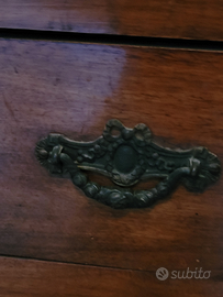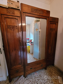 Armadio a tre ante, con specchio su anta centrale, in legno massello tinta noce chiaro, inizio '900 tutto originale ottimamente conservato. L'armadio è composto di tre elementi, con parte centrale dotata di ampio specchio con sfaccettatura perimetrale.Il corpo centrale avanzato rispetto ai due laterali conferisce all'armadio un piacevole movimento. Ante e velette superiori sono impreziosite con motivi floreali intagliati. Ferramenta e serrature con chiavi originali. Dimensioni: LxHxP 200x230x50 Disponibile, a parte, anche camera da letto completa nel medesimo stile (comò,letti e comodini).