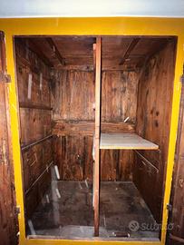 Armadio originale contadino con ante doppie e cassettone inferiore. Struttura solida in legno massello. Vernice gialla e decori bianchi, aspetto rustico. Misure indicative : Altezza 158cm, Lunghezza 100cm, Profondità 62 cm (fregio incluso). Ideale per agriturismo, b&b, arredo country o restauro. Solo ritiro a mano – zona Tredozio (FC)