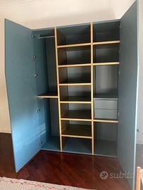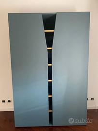 Armadio De Rosso modello Alfabeto: contenitore in blu ottanio materico con ripiani senape. 9 ripiani, due bastoni appendiabiti, due cassetti. Misure: L 149,5 H 226 P 61 cm Ritiro a Roma e smontaggio a carico dell'acquirente.