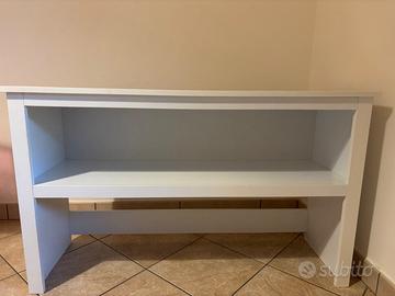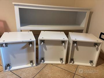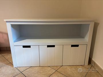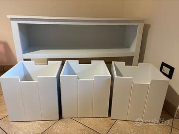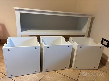 Armadio in legno, colore bianco, con ripiano e tre cassetti completamente estraibili con ruote. Ottime condizioni. Dimensioni armadio: cm 102x33x62h Dimensioni cassetti: cm 30x30x30