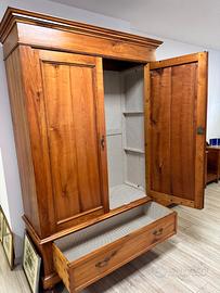 Vendo armadio a due ante antico di inizio ‘900, in condizioni perfette, in legno di ciliegio, con un ampio cassettone. Gli interni sono tutti rivestiti in carta adesiva e si presentano in buone condizioni. L’armadio è quasi completamente smontabile: rimangono interi la parte inferiore con il cassettone e il cappello, mentre le ante, i fianchi e lo schienale sono tutti smontabili con facilità così da agevolarne trasporto e ricollocazione.