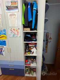 Colore legno bianco, dettagli blu e azzurro. Angolo contenitivo per oggetti grandi. Misure: lato armadio profondità 60 cm lunghezza 165 cm Componente angolare 92 cm X 94 cm Dimensione totale: 92 cm X 260 cm