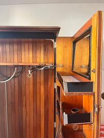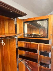 Armadio Compacton Originale da College inglese – Vintage con targa autentica Autentico armadio Compacton Ltd. con targa originale Vantage House, un vero pezzo da collezione per chi apprezza l’ingegnosità e il fascino dei classici inglesi. Il design interno è studiato al millimetro: tre luci alogene integrate illuminano l’intero volume, un ampio ripiano superiore offre spazio aggiuntivo e i due binari permettono di appendere comodamente diversi capi. Vano porta scarpe in basso. Le ante laterali offrono una capacità sorprendente: •Porta sinistra: cinque scomparti su tre livelli, spazio dedicato per cravatte e un vano per i pantaloni. •Porta destra: inserto di specchio nella parte superiore e nove scomparti totali, con due vani inferiori dotati di sportellino con chiave incorporata, più un compartimento aggiuntivo per i pantaloni. Robusto, pratico e con un’estetica senza tempo, questo Compacton porta con sé l’eccellenza dell’artigianalità inglese. È il mobile perfetto per chi cerca un mix di storia, carattere e funzionalità. Un oggetto che parla da solo. Dimensioni: L128 × A168 × P52 Colore: Legno Materiale dominante: Legno, rovere Stile: Vintage Condizione: Buono
