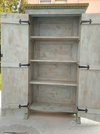 Armadio di legno nuovo, a 2 ante, decorato a mano, con serratura, delle seguenti misure: altezza 176,5 cm, larghezza parte superiore 98 cm, larghezza armadio 88 cm, larghezza base 89,5 cm, profondità parte superiore 40 cm, profondità armadio 35,5 cm, profondità base 43 cm.