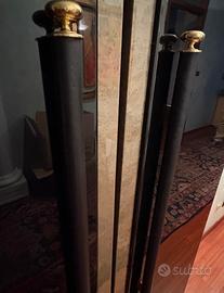Il mobile misura circa 2 metri per 1 metro, è in radica con maniglie in pelle e presenta porte scorrevoli.