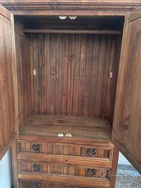 Questo mobile è un armadio guardaroba in stile rustico -country, realizzato in legno massello. Finitura naturale con ferramenta in metallo scuro, incluse cerniere a vista e maniglie a anello che richiamano lo stile coloniale o d'epoca.