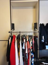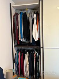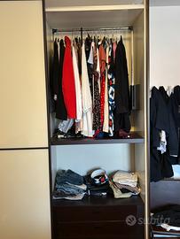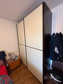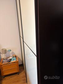Vendo armadio Doimo ad ante scorrevoli con da un lato un ripiano e due tubi e dall’altro un servetto e una cassettiera con 4 cassetti. Sponde in legno e ante in vetro. Altezza 2 mt e 70