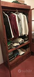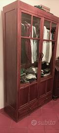 Vendo vetrina soggiorno con 2 ante vetrate con molatura. Due cassetti con serratura nella parte bassa. Due ripiani in legno massello. Nasce quindi come vetrina ma semplicemente inserendo la barra l ho utilizzata come armadio. Si può adattare ad entrambe le esigenze e gusti
