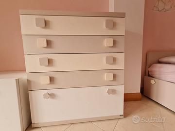 2) Cassettiera della Doimo CityLine, lateralmente laminata in bianco (alta cm 104, lunga cm 90 e profonda cm 46,4), con 4 cassetti (alti cm 15,5 ciascuno) di color magnolia e tortora alternati, e 1 cassettone color bianco (alto cm 31,6).