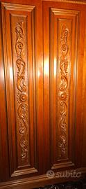 Vendesi armadio classico, in legno di ottima fattura, abbinato a due comodini nello stesso stile e materiale. L'armadio é da 6 vani. Il vano centrale, con ante decorate esternamente e specchiate all'interno, ospita la cassettiera.