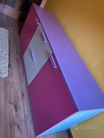 Vendo Armadio a tre ante scorrevoli su due binari a tre scomparti multiuso, e Contromobile a due ante battenti per due scomparti e due cassettoni, colori pastello viola/fucsia, materiale MDF Pannelli in fibra di legno legate con resina, marca Moretti Compact, cameretta bambina.