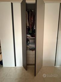 Vendo camera da letto Colombini composta da: armadio di design, con ante asimmetriche e cassettiera interna a 4 cassetti, di colore grigio, antracite e bianco. Il letto sempre color antracite vendo SENZA RETE E MATERASSO.