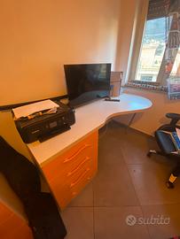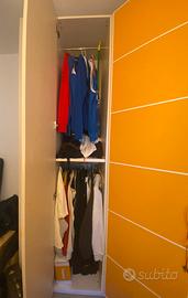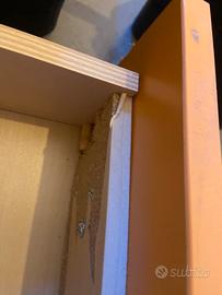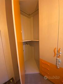 Armadio composto da : libreria, colonna, cabina, armadio 2 ante più cassettiera e scrivania con cassetti. Difetti: cassetto come da foto . Una Maniglia cassettiera e una maniglia cassetti scrivania da sostituire ( i cassetto si aprono regolarmente)