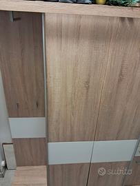 Vendo armadio entrata con porte scorrevoli, con all' interno 6 ripiani, a lato sinistro appendiabiti, a lato destro specchio con luce LED, due cassetti e una porta piccola battente.
