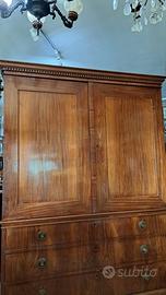 Spettacolare e raro armadio epoca Georgiana fine 700 in mogano,interni in rovere Il corpo superiore ha 2 ante con ripiani interni mentre il corpo inferiore ha 3 ampi cassetti. Maniglierie e serrature originali .Misura 150x57 altezza 210... M&P Antichità siamo un negozio specializzato in antiquariato vintage e shabby vendita al dettaglio e all ingrosso scarichi settimanali oltre 500 articoli in negozio, abbiamo una vasta scelta di como comodini tolette armadi letti vetrine vetrinette credenze servanti angoliere librerie tavoli tavolinetti sedie poltrone poltroncine divani lampade lampadari tappeti scrivanie scrittoi secretere ribaltine consolle quadri cornici specchi cassapanche bauli oggettistica varia idee regalo e molto altro ci troviamo a Roma zona Castelverde via Massa San giuliano 26b POSSIBILITÀ DI CONSEGNA E SPEDIZIONE IN TUTTA ITALIA PER INFO LUCA