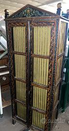 Splendido armadio in legno con decorazioni floreali dipinte a mano e struttura a griglia. Stile etnico/orientale, perfetto per ambienti ricercati.