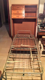 Caratteristico ed introvabile armadio giorno con 3 cassetti e un ripiano ; letto singolo a 1 piazza di notte a scomparsa . soluzione particolare x pernottamento ospiti . soluzioni transitorie di pernottamento e.o altro o x soddisfare esigenze abitative in appartamenti di piccolo taglio che necessitano un posto letto in aggiunta fisso o saltuario . armadio in legno impiallacciato anni 80 . struttura tubolare componibile a aprire - chiusura letto . buone condizioni di conservazione . materassino assente . necessita materasso 80 x 180 sp. 10 cm . meccanismo perfettamente funzionante .