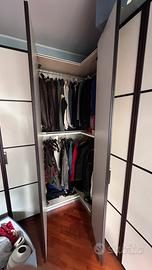 Grande armadio angolare 9 ante. Color panna con rifiniture in legno scuro. Diversi scompartimenti, cassetti e aste appendiabiti.
