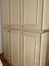 Armadio bambù molto leggero costituito da due parti separabili come si vede dalla fiancata della foto. Molto capiente. Due parti dell'armadio sono per i vestiti ele parti più strette hanno i pianetti. Trasporto a carico dell'acquirente. Per favore no perditempo.