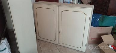 Questo mobile è un armadio a due ante in stile provenzale o shabby chic, caratterizzato da un colore chiaro e decorazioni lineari sui pannelli delle ante. All'interno sulla parete superiore ci sono due ganci per appendere comodamente le grucce di abiti.