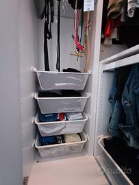 Armadio Guardaroba angolare Ikea (PAX/FARDAL/AHEIM) Misure 111/88x236 cm. Anta grigio chiaro lucido e anta a specchio. Completo di accessori interni aggiuntivi come da foto. Acquistato nuovo a marzo 2025. Smontaggio e trasporto a carico dell'acquirente.