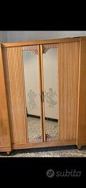 Armadio anni ’60 in legno chiaro con due ante centrali specchiate e decori originali.
