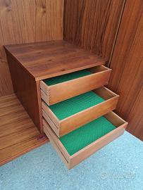 Mobile armadio guardaroba anni 60/70 in legno impiallacciato teak con zampe in ferro e ottone. Armadio a 2 ante con serratura e chiave, sollevato da terra tramite zampe in metallo, lineare nella forma in stile con il gusto dell'epoca. Al suo interno: un tubolare metallico per appendere le grucce, una cassettiera a 3 cassetti rivestiti con carta verde e sull'anta un appendino porta cravatte. Buone condizioni generali con alcuni graffi e segni del tempo.