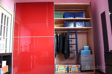 Armadio ante scorrevoli guardaroba. Finitura esterna rovere scuro, ante vetro rosso. Larghezza 270, altezza 240, profondo 65. Condizioni ottime.