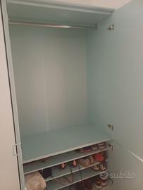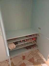 Vendo ampio e versatile armadio/guardaroba a quattro ante, ideale per l'ingresso, il ripostiglio o come soluzione aggiuntiva. Il mobile è in ottime condizioni e presenta un gradevole colore verde acqua chiaro (come da foto), perfetto per un tocco di freschezza in casa. L'armadio è diviso in due sezioni principali (superiore e inferiore), ciascuna con due ante. - Vano Superiore (Guardaroba): Spazio libero con tubo appendiabiti (come si vede in foto), ideale per giacche, cappotti, o altri capi appesi. - Vano Inferiore (Portascarpe/Ripostiglio): Dotato di ripiani a vista (circa 3-4 ripiani) perfetti per organizzare scarpe, borse, accessori o come spazio ripostiglio aggiuntivo. Misure Dettagliate (circa): Larghezza: 110 cm Altezza: 220 cm Profondità: 60 cm Condizioni: Il mobile è robusto e ben tenuto. E' montato e va smontato per uscire dalla stanza. Logistica: Ritiro a carico dell'acquirente in zona Porta Romana. Non si effettua spedizione.