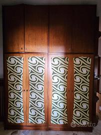 Armadio guardaroba vintage anni '60/'70 – legno noce – inserti in tessuto Armadio da ingresso (o camera) in stile Mid-Century Modern italiano, presumibilmente anni '60-'70. Design ricercato con caratteristiche originali dell'epoca: Struttura in legno noce impiallacciato Ante inferiori con inserti in tessuto originale verde/avorio con motivo grafico a spirali — dettaglio decorativo tipico del design italiano del periodo Ante superiori lisce con maniglie/serrature in metallo cromato squadrate Doppio modulo affiancato per grande capacità Struttura in due corpi sovrapposti (parte alta + parte bassa) Condizioni: buone per l'età, da valutare internamente. Ritiro a carico dell'acquirente provincia di Como. Non spedibile. Dimensioni: 208 cm larghezza, 297 cm altezza, profondità 40 cm, larghezza ante 50 cm.