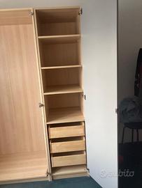 Vendesi armadio Ikea composto da due moduli Pax (100x58x201 e 50x58x201). Il modulo grande con bastone appendiabiti, un ripiano, due cassetti; il modulo piccolo con quattro ripiani e tre cassetti e anta a specchio. Si vende smontato.