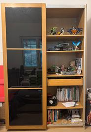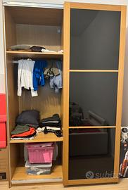 Armadio Ikea Pax, 2 ante scorrevoli in rovere e vetro nero, completo con accessori come da foto (6 ripiani, 1 appendiabiti e 1 cassetto) Smontaggio, ritiro e trasporto a carico dell’acquirente.