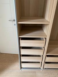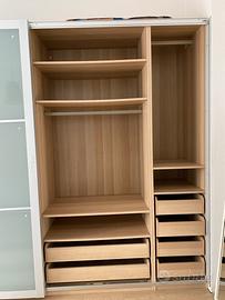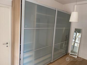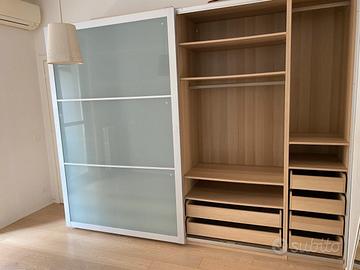 Armadio Ikea Pax, l 300, a 220, p 60, due ante scorrevoli vetro opaco semitrasparente, internamente rovere con 4 cassetti grandi e 8 piccoli piu diversi ripiani. L’armadio è stato usato ma è in ottimo stato. Smontaggio a carico dell’acquirente. Zona San Giovanni